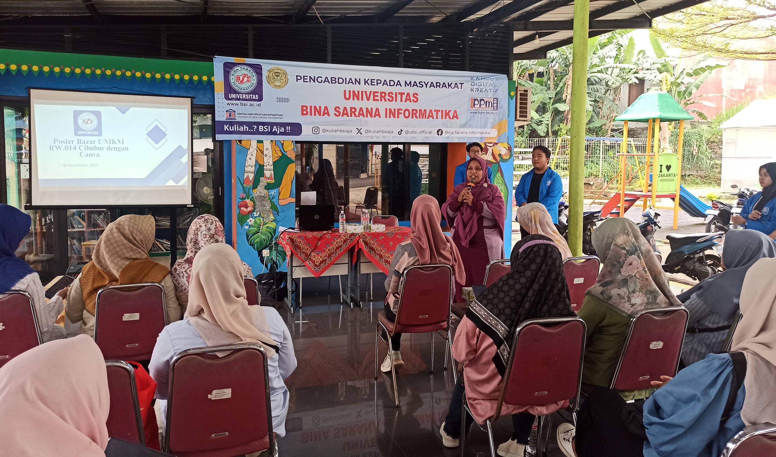 Pada tanggal 18 Oktober 2025, Dosen Universitas Bina Sarana Informatika (UBSI) mengadakan kegiatan Pengabdian Masyarakat di RPTRA Cibubur Berseri dengan memberikan pelatihan Canva kepada 20 kader PKK RW.014 Cibubur. Pelatihan ini bertujuan untuk meningkatkan kemampuan kader dalam membuat laporan kegiatan yang lebih menarik dan efisien secara visual. Selama pelatihan, peserta dikenalkan dengan dasar penggunaan platform Canva, serta diajarkan cara membuat laporan visual, poster kegiatan, dan dokumentasi digital.